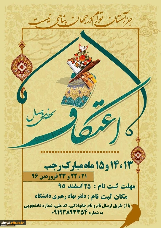 امتیاز دهید : ثبت نام اعتکاف دانشجویی دانشگاه فرهنگیان استان قزوین 2 سهشنبه 24 اسفند 1395 ساعت 15:02