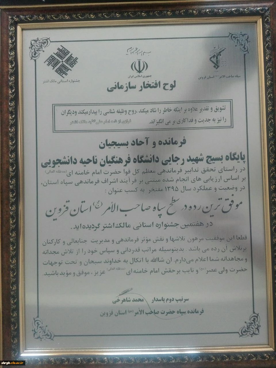 پایگاه بسیج دانشجویی پردیس شهید رجایی دانشگاه فرهنگیان قزوین در جشنواره مالک اشتر، موفق به کسب عنوان "موفق ترین حوزه" شد. 2