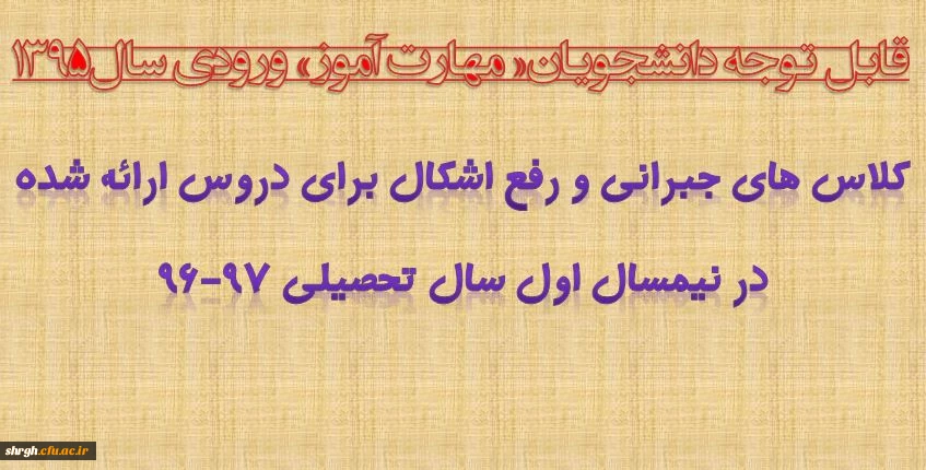 قابل توجه دانشجویان« مهارت آموز» ورودی سال1395 کلاس های جبرانی و رفع اشکال برای دروس ارائه شده در نیمسال اول سال تحصیلی 97-96 2