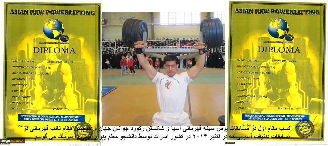 کسب مقام اول در مسابقات پرس سینه قهرمانی آسیا و شکستن رکورد جوانان جهان و همچنین مقام نائب قهرمانی در مسابقات ددلیفت آسیایی که در اکتبر 2014 در کشور امارات توسط دانشجو معلم پدرام امینی را تبریک می گوییم